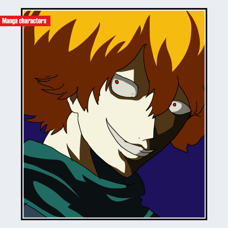 『銀魂』に登場する斉藤終(さいとう しまる)は、赤みの強いブラウン系の髪色を持つ短髪構造で、前髪は鋭い束が左右へ割れて額に落ちる形状となっている。顔の右半分に深い影が落とされ、輪郭の直線的造形が強調されている。目は赤い瞳孔をもつ細い描線で描かれ、上下のまぶたが鋭く閉じ気味に形成されている。口元は横に大きく開き、歯を露出させる描線が外形の動的アクセントとなっている。上半身は暗色の衣装で、首元に立ち上がる襟パーツが確認できる。全体として「人型(戦闘衣装系)」に分類され、影表現・鋭い前髪束・赤い眼が主識別点となる。