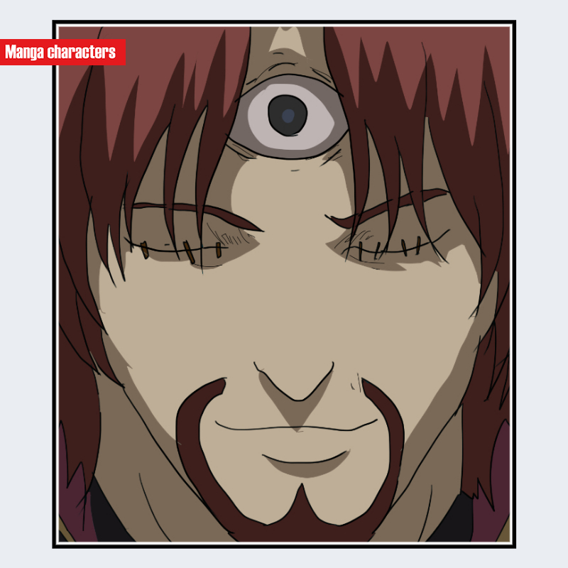 『銀魂』に登場する馬董(ばとう)は、赤みの強い長髪を持ち、額中央に円形の第三の眼のようなパーツが配置されている点が最大の視覚的特徴となる。前髪は額を覆うように下り、左右に分かれる束構造で描かれている。目元は閉じられており、まつげ部分は細い直線で処理され、表情の静止感が強調されている。口元には左右へ大きく湾曲した髭が伸び、下顎ラインの造形と一体化している。全体として「異形型(第三眼構造)」に分類され、人型ながら非日常的な額パーツと髭形状が主要な識別点となる。