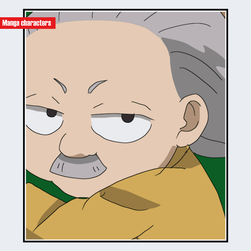 『銀魂』に登場する柳生敏木斎(やぎゅう びんぼくさい)は、広く後退した額と、頭頂部から左右へ流れる灰色の長髪が特徴である。眉は短く角度のある細線で描かれ、まぶたは半閉じで水平気味の造形となっている。鼻は丸みを帯びた小振りの形状で、口元には短い口ひげが明確な塗り分けで配置されている。頬から顎にかけての輪郭線は丸く、柔らかい外形を形成している。衣装は淡い黄色系の布地が見え、人型の“老年造形”に該当する構造である。