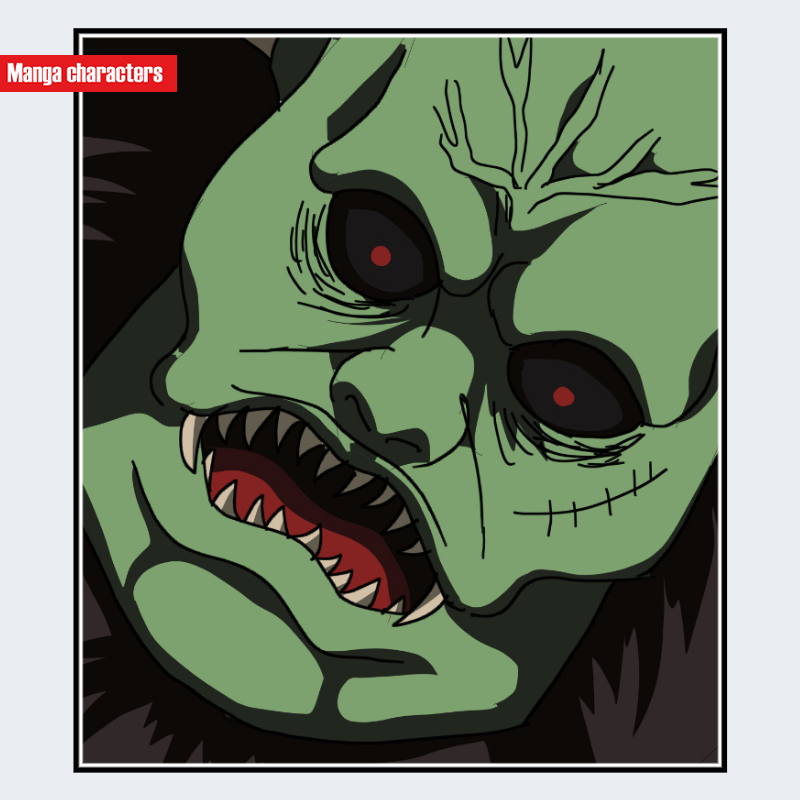 『銀魂』に登場する屁怒絽(ヘドロ)は、全身が緑色の皮膚で構成された“異形系”の造形を持ち、顔面には深い皺や凹凸が強調されている。目は真紅で瞳孔がほとんど描かれず、眼窩の暗さが際立つ構造である。口は大きく裂け、鋭い牙が上下に不規則に並ぶ形状で、歯列の露出面積が広く作画されている。鼻梁は低く潰れた形で、頬〜顎にかけての陰影が強く、骨格のゴツさを際立たせる“怪異型”の顔面構造である。同作品内でもとくに“強異形”の分類となる造形である。