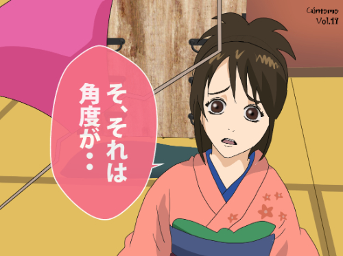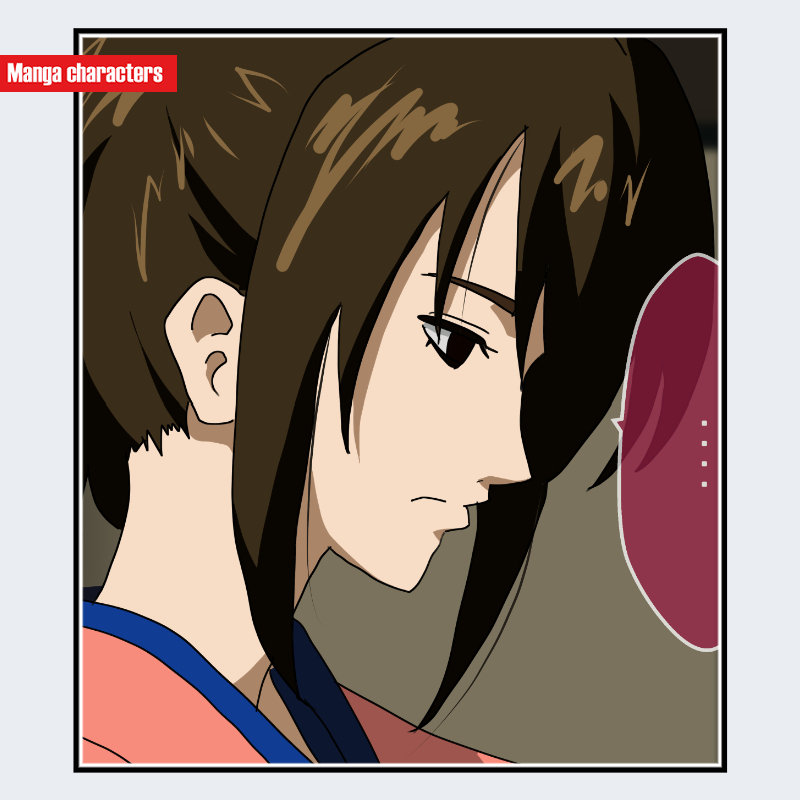 『銀魂』に登場する志村 妙は、肩まで伸びるブラウン系のストレートヘアを持ち、前髪の一部が頬に沿って斜めに落ちる非対称配置が特徴である。耳まわりは輪郭線が大きく露出する構成で、髪束と素肌が明確に分離される「輪郭強調型」のレイヤー処理になっている。衣装は視認範囲では青系の上衣が確認でき、端部の折り返しがない単層布構造である。横顔の線処理は細めで、同作の男性キャラ(太線寄りの造形)とは差別化された軽量線のフェイスラインが用いられている。