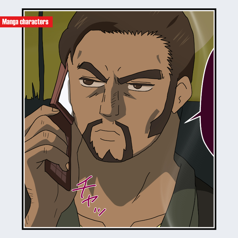 『銀魂』に登場する小銭形 平次は、短く刈り込んだサイドと額の生え際を強調する前髪のないヘアスタイルを持ち、頭部の輪郭が明瞭に露出する「刈上げ強調型」の構造である。眉は太く直線的で、目元は上まぶたの濃い描線が強調される鋭角寄りの構成となっている。口元には明確な顎髭と口髭が描かれ、髭のラインが頬の陰影と連続して面を形成する。衣装は視認範囲では暗色の上衣で、襟元が直線的な「単層布構造」による硬めのシルエットでまとめられている。