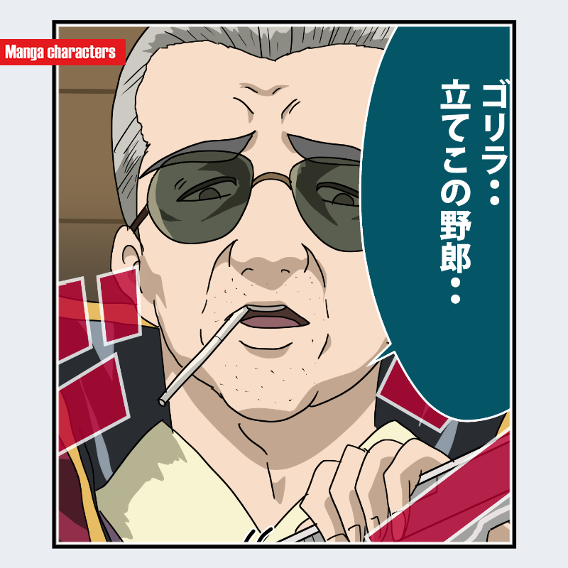 『銀魂』に登場する松平 片栗虎は、頭部の前面に大きく露出する額と、短く後退した生え際を持つ「額露出型」のヘア構造を特徴とする。サングラスは濃色レンズと太めのフレームによって顔の上半分を覆い、目元の情報をほぼ遮断する視覚装備として機能している。口元には深い法令線が走り、唇の形状が強調される描線が採用されている。加えて、口に咥えたタバコが輪郭線の一部として扱われ、顔周りの要素が前後レイヤーで分離されている。衣装は視認範囲で黒系の上衣が確認でき、襟元の交差が少ない単層布のシンプルな構造である。