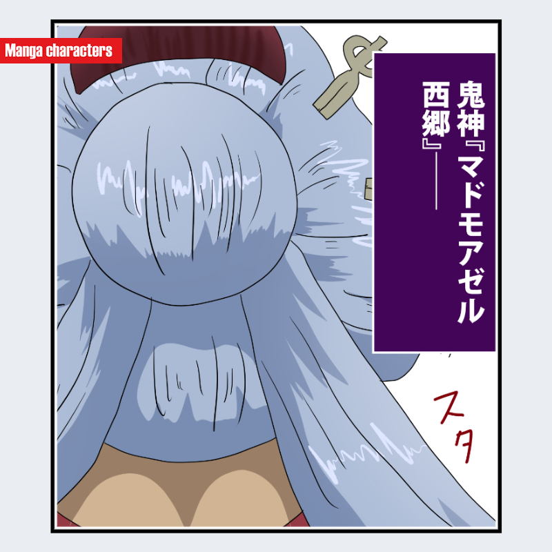 大柄キャラで長髪を背面に流す造形は他作品にも見られるため、『銀魂』の西郷 特盛は巨大上結いと扇状の側面毛束、さらに髭と髪色が同色で統一される点で識別できる。