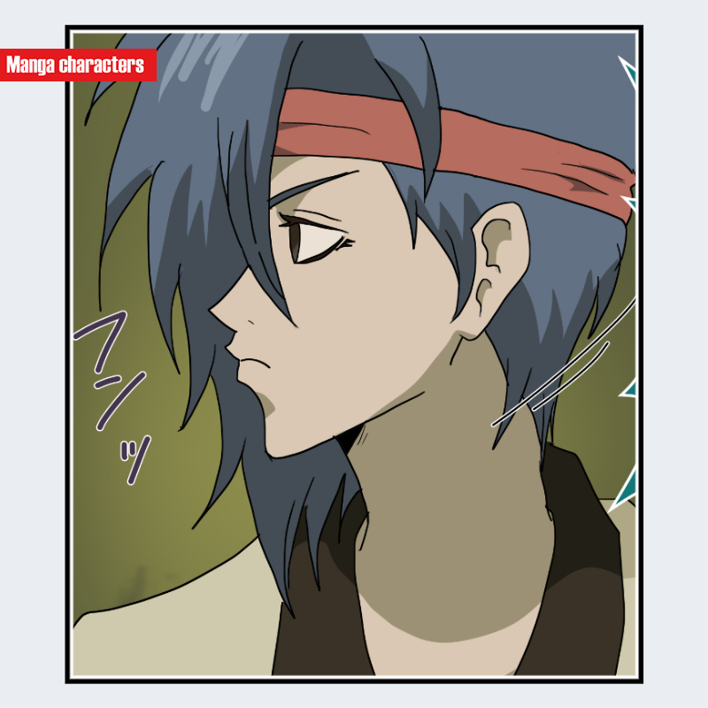 『銀魂』に登場する村田 鉄子は、青みがかったロングヘアを後方へ流す構造を持ち、額まわりには短い前髪束が斜めに落ちる「前束分離型」の髪配置が採用されている。頭部には赤系の幅広バンダナが巻かれ、髪束の根元を押さえる形で固定されているため、頭頂部のボリュームが左右に広がりやすい。横顔の輪郭線は細く処理され、顎のラインが直線的に落ちる点が特徴である。耳周りは露出が大きく、髪束と素肌の境界が明確に分割されたレイヤー構造となっている。
