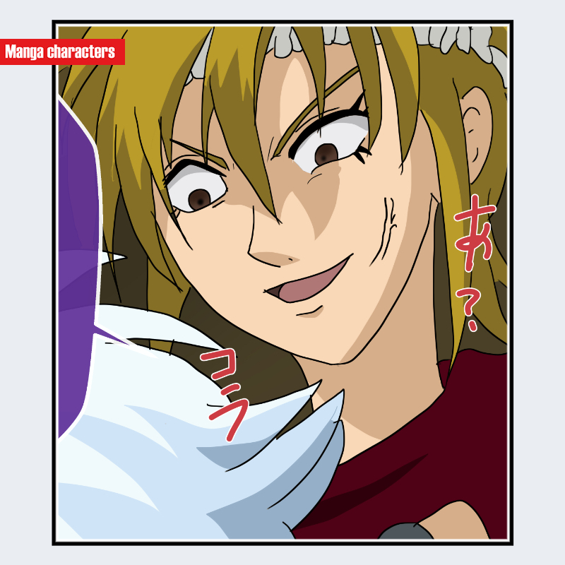 『銀魂』に登場する辰巳は、明るい金髪のロングヘアを荒く束ね、前方へ鋭く落ちる複数の前髪束による「鋭角前束型」の髪構造を持つ。輪郭まわりの髪束は上下に分岐し、頬の外側へ向かって鋭い角度で跳ねるレイヤー配置となっている。目元は上まぶたの太い描線が際立ち、下まぶたは細い補助線で構成される二層処理で、視線方向が強調される造形。口元は大きく歪曲した開口形状で、頬に短い斜線が入ることで表面の凹凸が強く示されている。衣装は視認範囲外が多いものの、首元に白系の布地が確認できる単層布構造である。