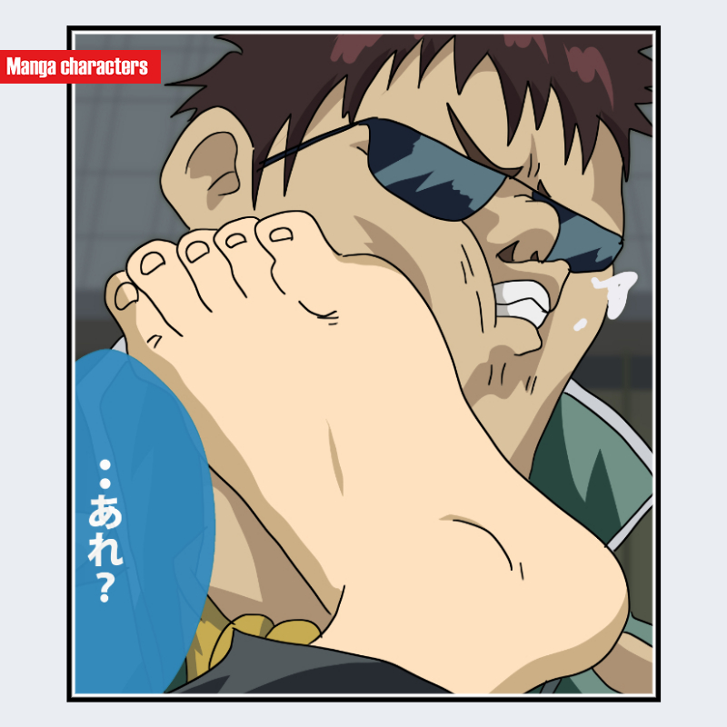 『銀魂』に登場する長谷川 泰三(マダオ)は、短く乱れたダークブラウン系の髪と、額から不規則に落ちる細い前髪束による「乱束短髪型」の構造を持つ。サングラスは濃色レンズで横幅が広く、顔の上半分を大きく覆うため、目元の情報がほぼ隠される。頬・鼻筋には強い影線が入り、輪郭の凹凸を誇張する描線が用いられている。今回の視認範囲では大きな足が手前に重なっており、顔まわりのレイヤー構造が前後に明確に分離されている点が特徴となる。