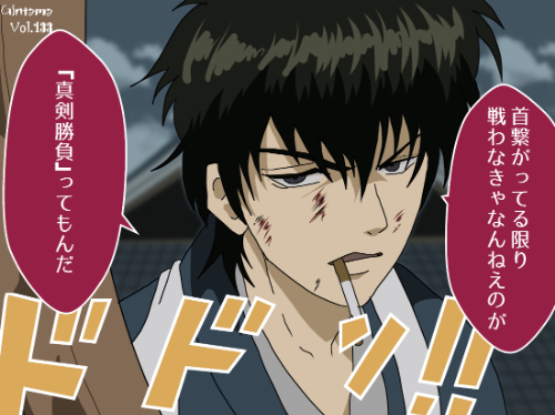 影線強調の横顔造形は他作品でも類似しやすいため、『銀魂』の土方 十四郎は詰襟風の軍装系上衣と濃色ショートレイヤー、前景の刀の三点で識別すると確実である。