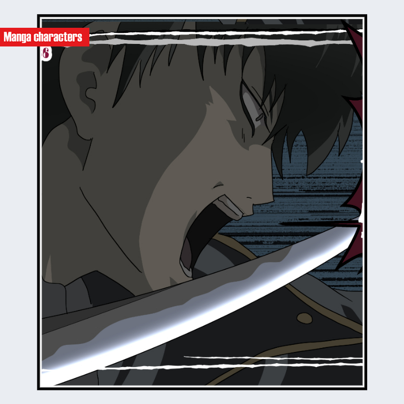 『銀魂』に登場する土方 十四郎は、深い影線で構成された横顔シルエットが特徴で、頬・顎・首元に強いコントラストを伴う「影線強調型」の描線構造となっている。髪は濃色のショートレイヤーで、側頭部の束が外側へ鋭く跳ねる配置が確認できる。口元は大きく開き、上下の歯列が白い面として描かれ、顔の下半分に高い明度差が生まれている。衣装は視認範囲では濃色の詰襟型上衣が見られ、金属的な装飾が直線的に配置された「軍装系上衣構造」となっている。手前には刀の刃が重なり、鋭いハイライトが前景レイヤーとして処理されている。