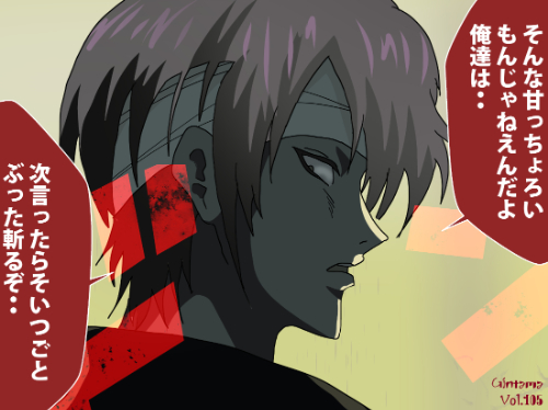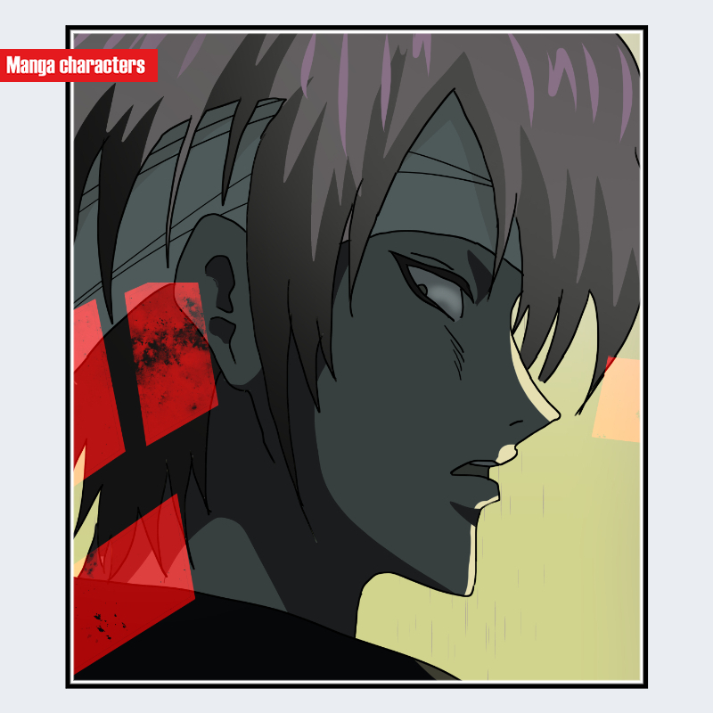 『銀魂』に登場する高杉 晋助は、暗色のショートレイヤーを基調とし、額に巻かれた白い包帯が前髪束の根元を押さえる「包帯固定型」の髪構造を持つ。側頭部から頬に落ちる髪束は鋭角に分かれ、顔の縦方向のラインを強調する配置となっている。横顔は濃い影線で大きく覆われ、頬・顎・首元にかけて面が強く分割される「影線強調型」の描線が特徴である。衣装は視認範囲で黒系の上衣が確認でき、襟元に直線的な装飾が入る単層布構造となっている。