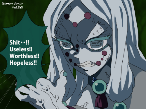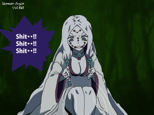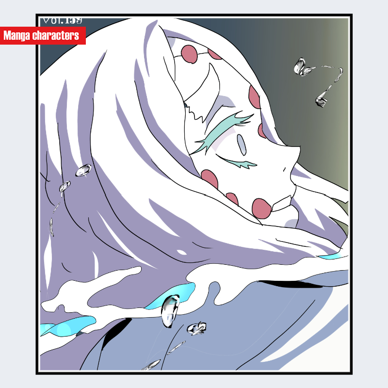 『鬼滅の刃』に登場する「母蜘蛛」は、白色を基調とした長い髪が肩から大きく波打つように垂れ、全体が布状のレイヤーに包まれた造形を持つ。顔には赤い球状パーツが対称的に配置され、蜘蛛系意匠を示す「擬獣化構造」が明確である。衣装は淡紫色の広い布が前面を覆い、上半身に滑らかな曲線の重なりを形成している。姉蜘蛛と比較すると、装飾配置がより曲線的で、外衣に包まれるような視覚階層が印象的である。