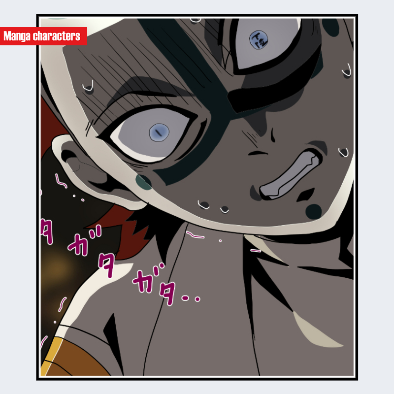 『鬼滅の刃』に登場する「釜鵺(かまぬえ)」は、白髪を荒く逆立てた髪型を持ち、頭部の片側に暗色の模様が大きく走る生体意匠が特徴である。顔面には太い緑系の縦線が入り、眼は片側が大きく見開かれた構造で描かれている。上半身は露出しており、可視範囲では衣装的要素よりも肌表面の模様が主体となる視覚階層が形成されている。同作の蜘蛛系キャラ群と比較すると、角状パーツはなく、生体模様の比率が高い「生体模様構造」が中心となっている。