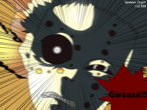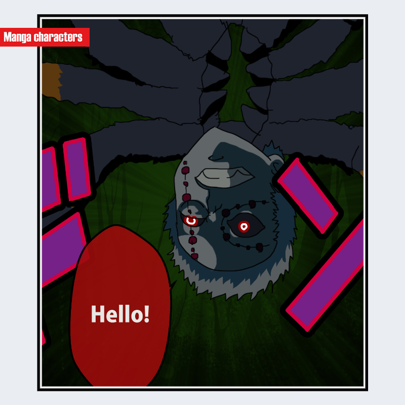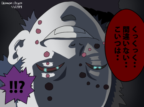 『鬼滅の刃』に登場する「兄蜘蛛」は、灰青色の肌と白髪を基調とした外観を持ち、顔面には赤い球状パーツが左右対称に並ぶ「擬獣化構造」が明確である。眼は赤く発光するような描写で、黒い縁取りによって強い生体的コントラストが生じている。髪は短く逆立ち気味で、頭部から顎にかけて濃い影が落ち、輪郭の区画が強調されている。上半身の可視範囲では衣装よりも肌表面の色分布が主となり、蜘蛛系キャラ特有の生体模様による視覚階層が形成されている。