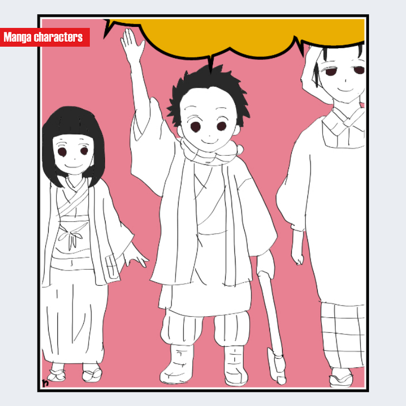 『鬼滅の刃』に登場する「竈門竹雄(かまどたけお)」は、短く整えられた黒髪と、幼年体型に合わせた素朴な和装が特徴である。上衣は淡色で袖が広く、腰紐で軽く結ばれた「日常衣装型」の構造を持つ。裾はやや短めで、子どもらしい体格が衣装ラインに反映されている。装飾は最小限で、輪郭線と衣服のシルエットが造形の大部分を占め、同作の成人男性キャラに比べても軽量な衣装構成となっている。