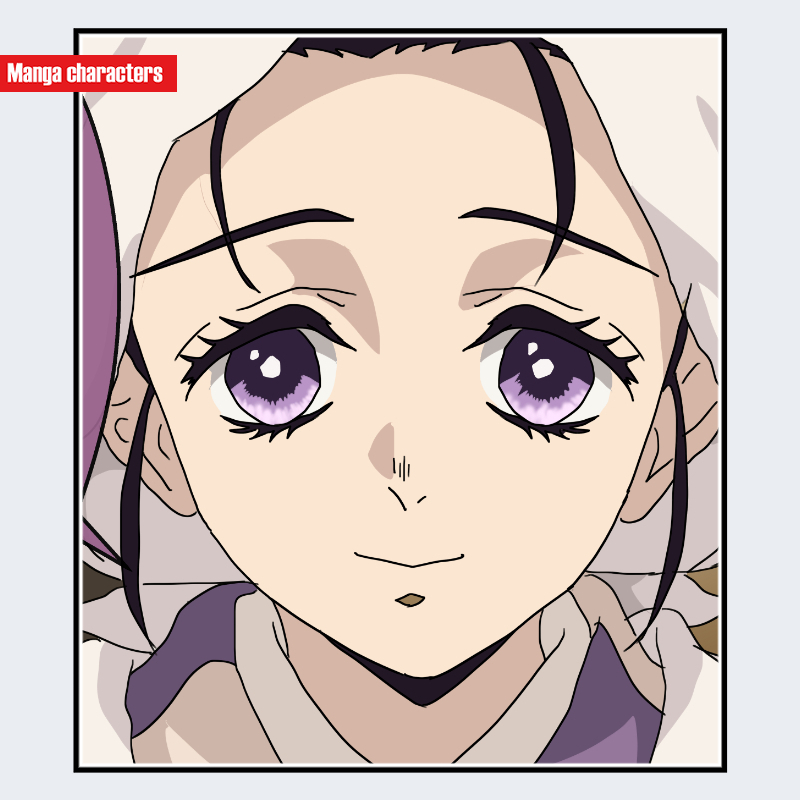 『鬼滅の刃』に登場する「竈門葵枝(かまどきえ)」は、柔らかい輪郭線で描かれた顔立ちと、淡い紫色の大きな瞳が特徴である。髪は落ち着いた色味のロングヘアで、後方へ自然に流れる形状を取り、額や頬の可視範囲に髪がかからない整った造形となっている。衣装は淡色の和装で、襟元の層構造が丁寧に区切られており、「日常衣装型」の視覚構造に分類される。全体として装飾は控えめで、輪郭と衣装のシルエットが主要な視覚情報を形成している。