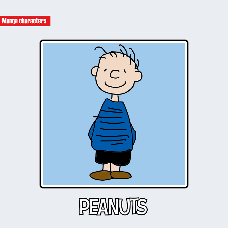 『ピーナッツ』に登場するライナス・ヴァン・ペルトは、頭部に短い線状の髪がまばらに配置された独特のシルエットが特徴で、細い毛束が上方向に向かって立つように描かれている。顔は丸い輪郭に点状の目と簡略化された鼻・口が配置され、シリーズ特有の最小限線構造で表現されている。衣装は青系のストライプが入った長袖トップスで、横方向の均一な線が衣装全体の視覚アクセントを形成している。下半身は黒いショートパンツと茶色い靴が組み合わされ、全体として「日常児童型/ストライプ衣装構造」に分類される。