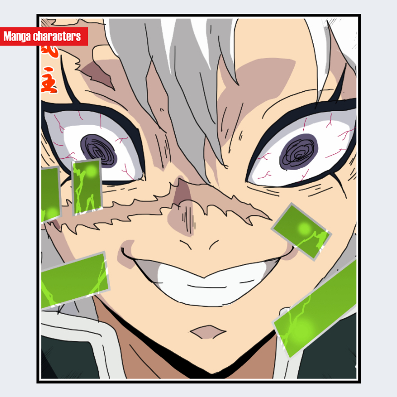 『鬼滅の刃』に登場する「不死川実弥(しなずがわ さねみ)」は、白髪の短い逆立ち気味の髪型と、顔面から首にかけて刻まれた鋭い傷跡が特徴的である。瞳は紫系で血走った線が入り、強いコントラストの「生体模様構造」を形成している。口元は大きく露出した歯列が目立ち、表情線が深く刻まれた造形となっている。可視範囲では制服系の衣装が確認されるが、衣装よりも肌表面の模様と表情の線が主視覚情報を占める。