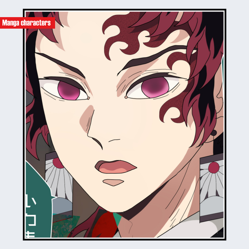 『鬼滅の刃』に登場する「継国縁壱(つぎくに よりいち)」は、滑らかな額と整った輪郭線を持つ人物型の造形で、深い赤紫系の瞳が最も特徴的な視覚要素となっている。髪は黒を基調としつつ、側頭部から前方へ流れる赤みのある房が混在し、曲線的な毛束構造をつくっている。肌は均一な淡色で陰影が少なく、装飾的要素は耳元の飾りのみが確認できる。全体として「人物型・和装構造」を基盤とした造形であり、異形パーツや生体模様は見られない。