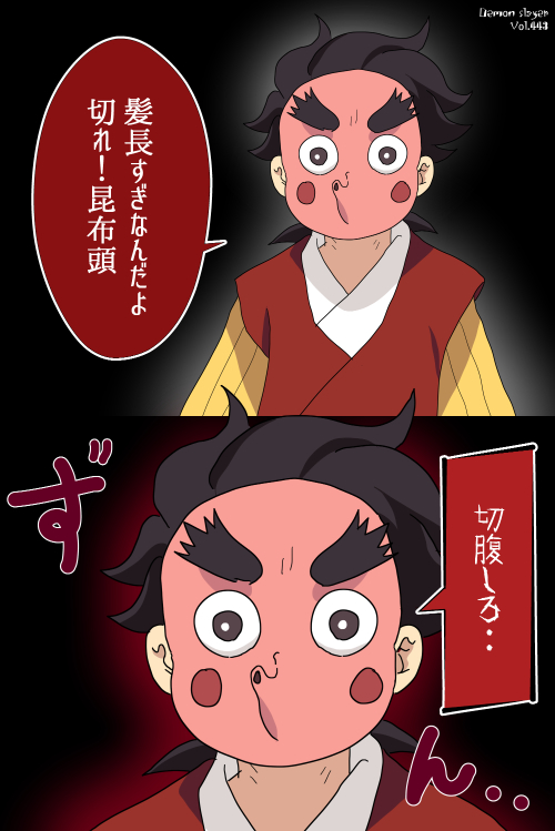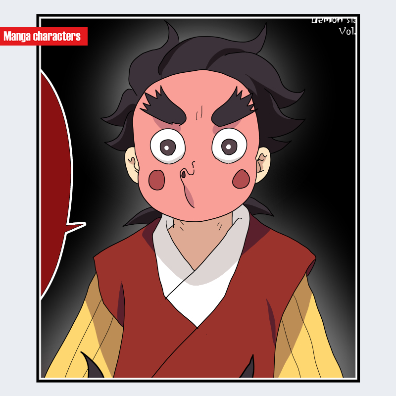 『鬼滅の刃』に登場する「小鉄(こてつ)」は、丸みのある子ども体型の輪郭に、顔面を大きく覆う赤色の面が装着された「仮面構造型」の人物である。仮面は円形の頬模様と太い眉状ラインが強調され、表情を単純化した視覚意匠になっている。髪は黒色で、頭頂部から後方に向かって短く広がる束状の造形を持つ。衣装は赤系の羽織と白の和装インナーで構成され、上半身の衣服ラインは直線的かつシンプルである。