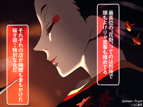 和装・髪飾り・丸い目の組み合わせは他作品の遊女系キャラと混同されやすいが、本作では髪の結い上げ方と襟の層構造が識別点となる。