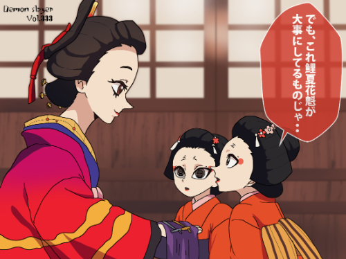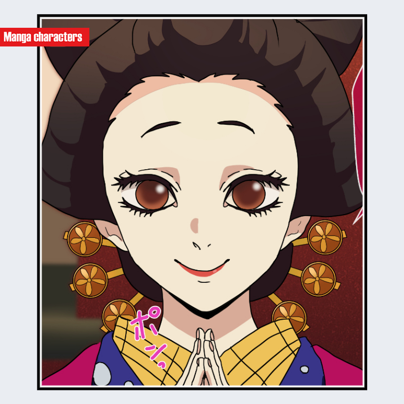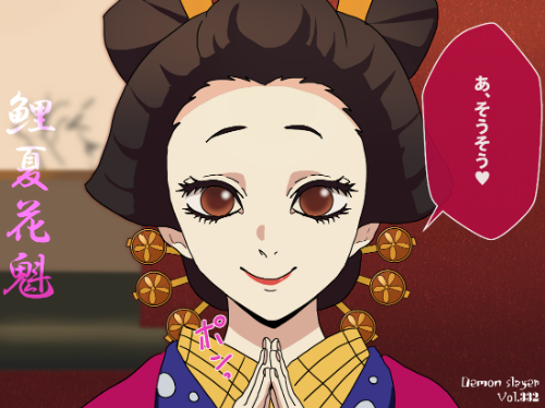 『鬼滅の刃』に登場する「鯉夏(こいなつ)」は、整った丸い輪郭と長く濃いまつ毛に縁取られた大きな瞳が特徴の人物型キャラクターである。髪は黒髪を高くまとめた和装特有の結い上げ構造で、側頭部から後頭部にかけて滑らかな曲線が形成されている。衣装は華やかな和装で、首元から肩にかけて多層的な襟構造が確認でき、背後の髪飾りや花を模した装飾パーツが視覚的アクセントとなっている。全体として「人物型・和装構造」を基盤とした造形で、肌の陰影は控えめで輪郭線の明瞭さが強調されている。