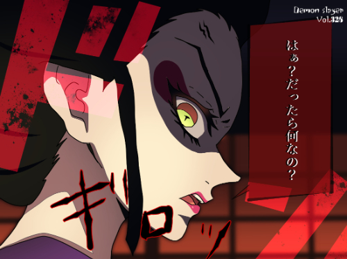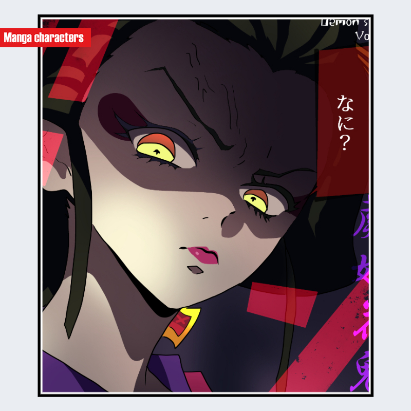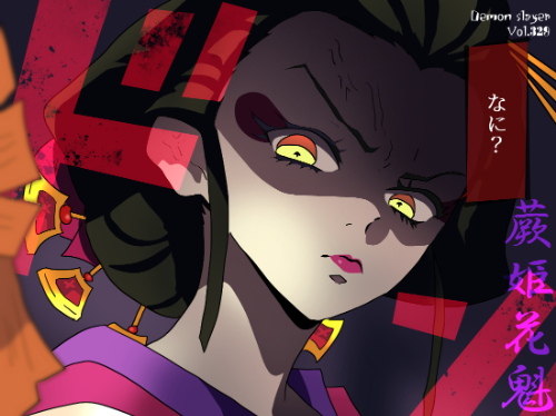 『鬼滅の刃』に登場する「蕨姫花魁(わらびひめおいらん)」は、鋭い吊り目と黄色を基調とした大きな瞳が特徴で、黒い縁取りと赤のアクセントによって強い視覚コントラストが形成されている。髪は黒色の長髪で、頭頂部から後方にまとめられ、側面から太い毛束が下へ流れる造形となっている。肌は淡色で陰影が深く刻まれ、頬には濃色の円形模様が配された「生体模様構造」に近い特徴がある。衣装は艶やかな和装で、襟元から肩にかけて緩やかな曲線の層構造が確認できる。