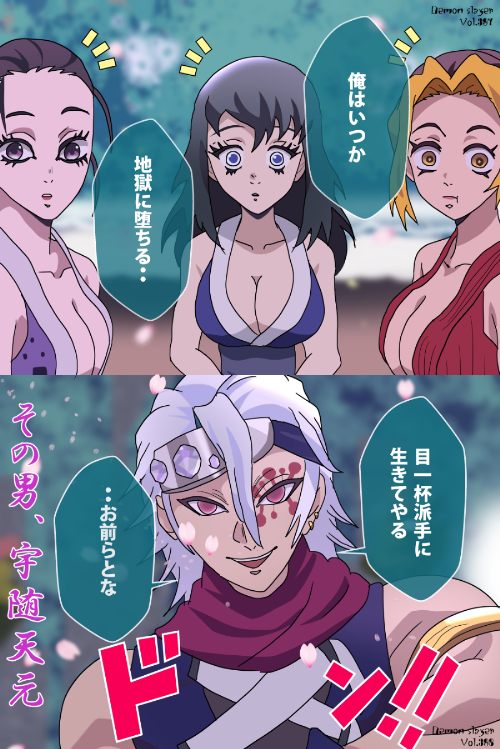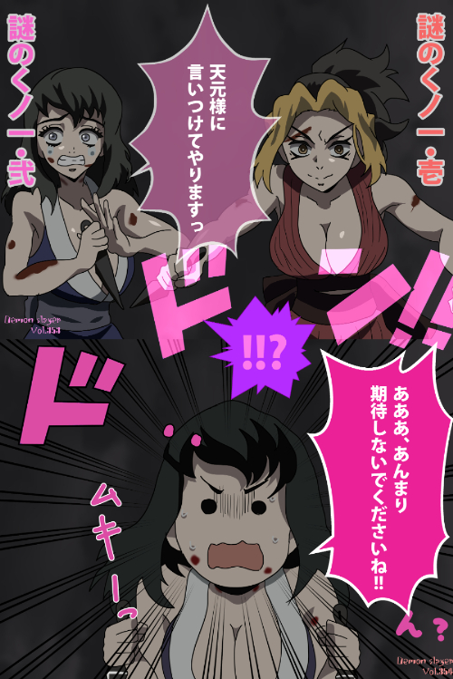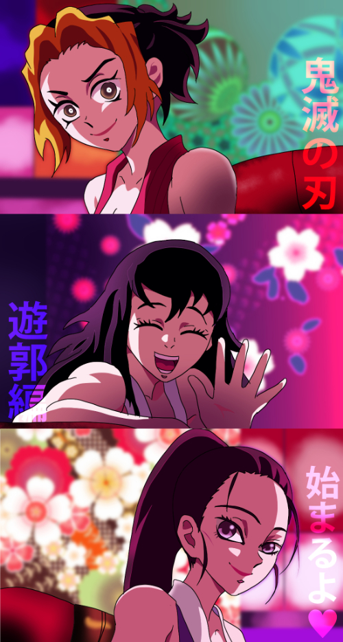 『鬼滅の刃』に登場する「須磨(すま)」は、濃い紫寄りの黒髪を肩下まで伸ばした髪型で、前髪は大きく分かれた曲線的な束が特徴となっている。瞳は茶系で大きく、黒い縁取りにより視覚的コントラストが強調される「人物型」の造形である。口元は大きく開いた表情線で描かれ、頬の陰影は最小限に抑えられているため、輪郭と目の造形が主たる視覚情報となる。衣装は淡彩の布地で肩から胸元にかけて直線的に区切られ、外部装飾パーツや生体模様は確認されない。