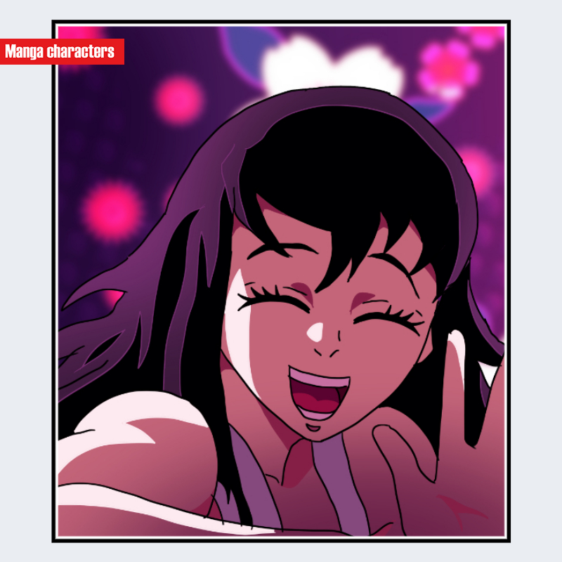 大きく開いた表情と長い黒髪の組み合わせは、他作品の喜劇系キャラと混同されやすいが、髪束の流れ方と瞳の茶系色が本作特有の識別点となる。