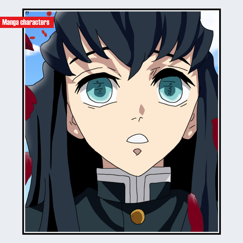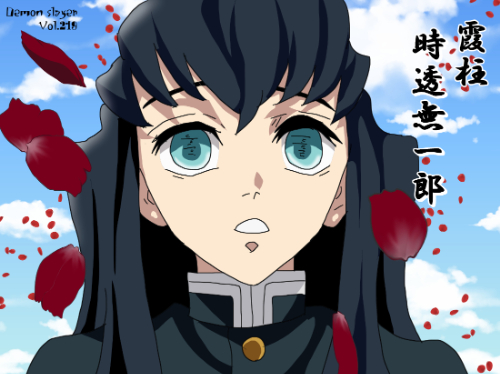 『鬼滅の刃』に登場する「時透無一郎(ときとう むいちろう)」は、淡い青緑色の大きな瞳が強い印象を与える人物型キャラクターである。瞳は内側に淡いハイライトが入り、黒い縁取りによって視覚階層が明瞭に形成されている。髪は黒を基調とした長髪で、毛先に向かって青緑色のグラデーションが入り、束が縦方向にまっすぐ落ちる構造を持つ。衣装は隊服に相当する濃色の上衣で、襟元は直線的な層構造になっている。表情の線は最小限で、瞳と髪のコントラストが主たる視覚要素を構成している。