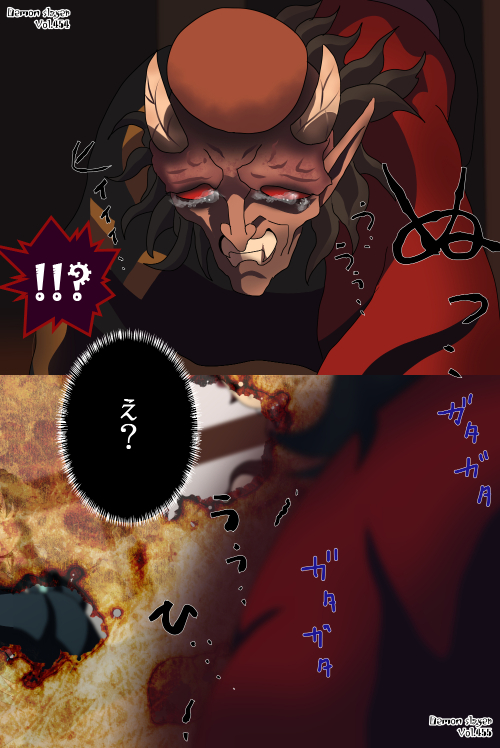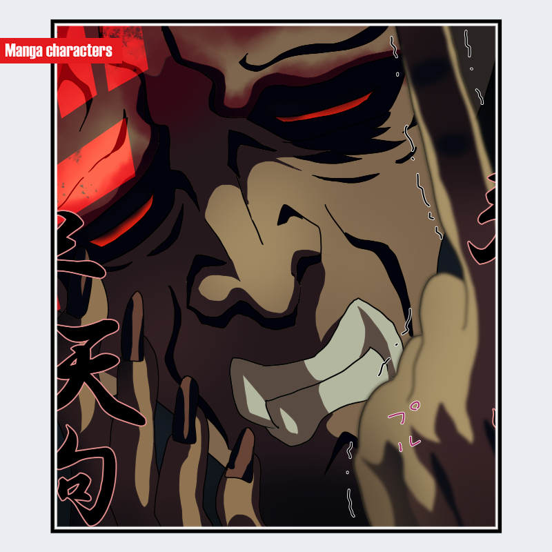 『鬼滅の刃』に登場する「半天狗(はんてんぐ)」は、額から目元にかけて深く刻まれた皺と凹凸が強調された「異形体構造」のキャラクターである。肌は淡褐色で、陰影が強く、顔全体に立体的な溝が走っている。瞳は赤色の細長い形状で、上まぶた側に強い赤い発光表現が入り、視覚的な圧を生む造形となっている。頭部には角状の突起が左右に伸び、髪は黒色の短い束が不規則に広がる形で構成されている。口元には鋭い歯列が露出し、表情の線が深く刻まれている。