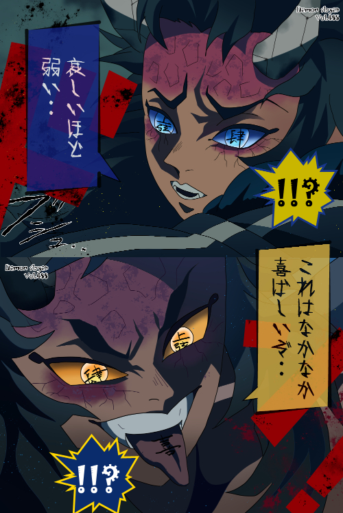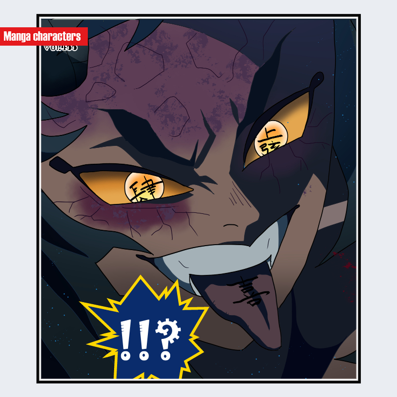 『鬼滅の刃』に登場する「空喜(うろぎ)」は、黄色の瞳に黒い放射状の線が走る「生体模様構造」を持ち、瞳孔周囲の濃色リングが強い視覚階層を形成している。額から目の周囲には赤紫色の網目状の血管風模様が広がり、肌の淡色との対比が際立つ。髪は黒基調で、太い束が額側へ大きく流れる造形となっている。牙状の歯が露出する口元と、顎や舌に見られる黒い記号的模様が特徴的で、全体として異形寄りの人物型構造が確認できる。