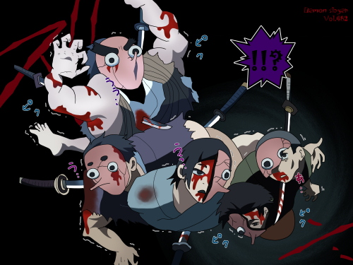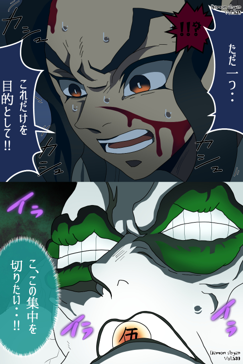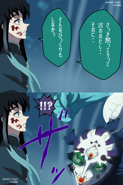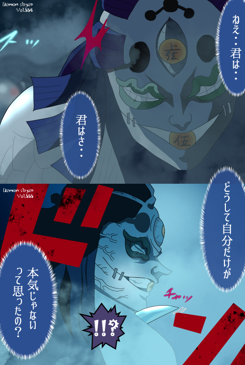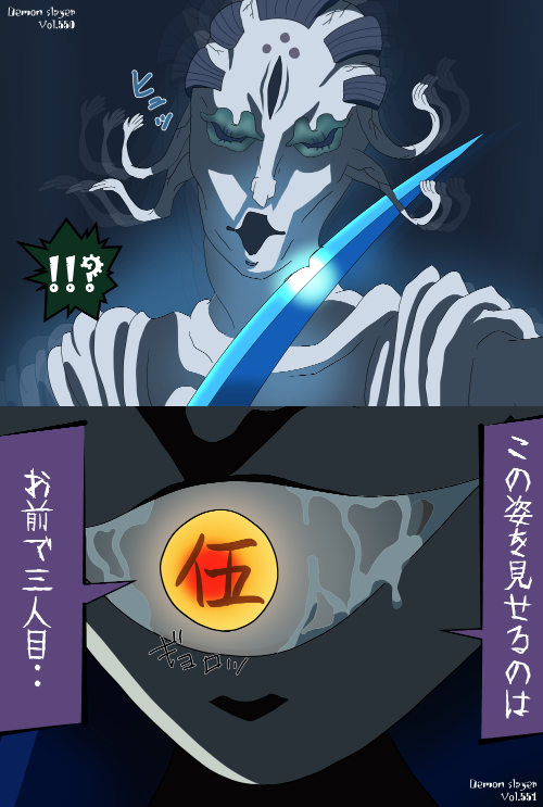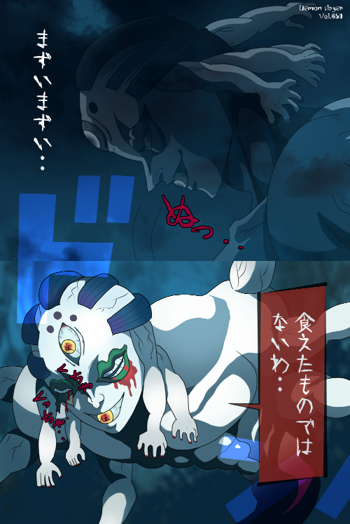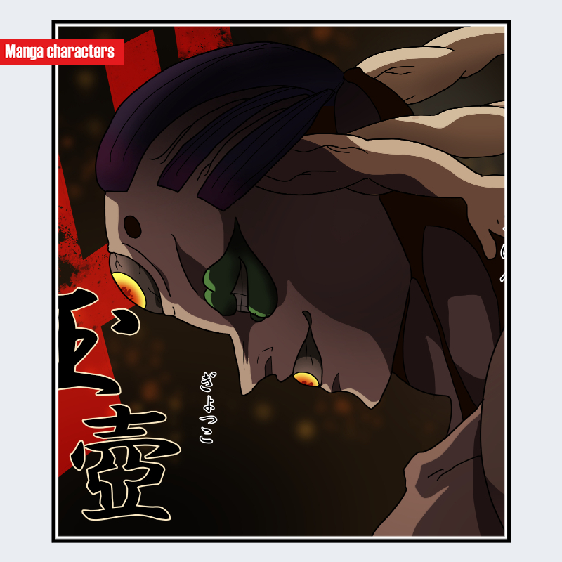 『鬼滅の刃』に登場する「玉壺(ぎょっこ)」は、上半身が白く膨張した球体のような形状で、複数の目が左右非対称に配置された「多眼異形型」の構造を持つキャラクターである。目は黄橙色の虹彩と黒い瞳孔を持ち、周囲に赤い縁取りが見える。顔面は強く隆起し、頬や額には青紫色の筋状模様が走る。髪は短い房状で、濃い青紫系の色彩が配されている。身体側面には器のような造形が存在し、全体的に「壺」や「生物的曲面」を思わせる立体構造が形成されている。