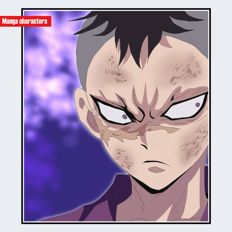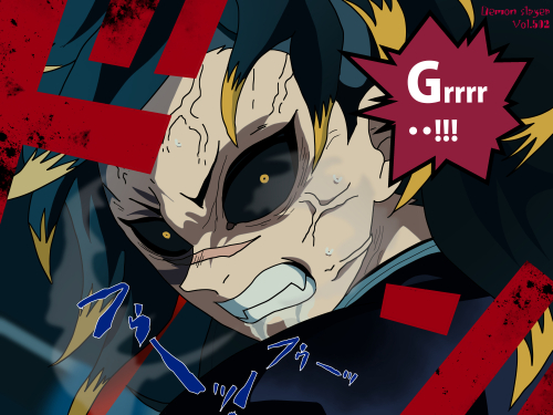 『鬼滅の刃』に登場する不死川玄弥は、短く切りそろえられた黒髪と、額から頬にかけて広がる濃淡のある模様が視覚的特徴となっている。眉付近に走る筋状の影によって、目元が強調される構造を持ち、眼は白目部分が広く見える描線で形成されている。上半身はシンプルな衣装だが、可視範囲では色調の差が少なく、肌と模様のコントラストが主な視覚要素を構成する。「素体強調型/部分装飾構造」に分類でき、同作の鬼化表現とは異なり、外殻や角を用いず、表皮の濃淡による記号化が中心となっている。