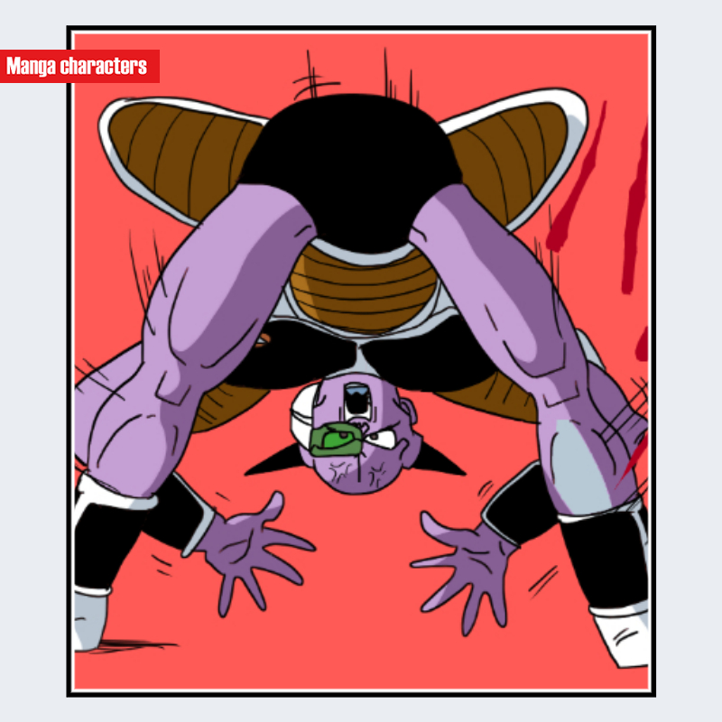 『ドラゴンボール』に登場するギニューは、紫色の皮膚と大柄な体格を基盤とした外観を持ち、頭部には左右に張り出す2本の角状パーツが配置されている。胸部と肩を覆うバトルアーマーは硬質な外殻を思わせる構造で、肩パッドの曲線形状がシルエットを強調する。腰・脚部にはアーマー下に密着する黒系のスーツが見え、「戦闘服融合型/外殻装甲構造」に分類できる。同特戦隊メンバーと比較すると、角の位置と頭部形状が特に識別要素として際立つ。