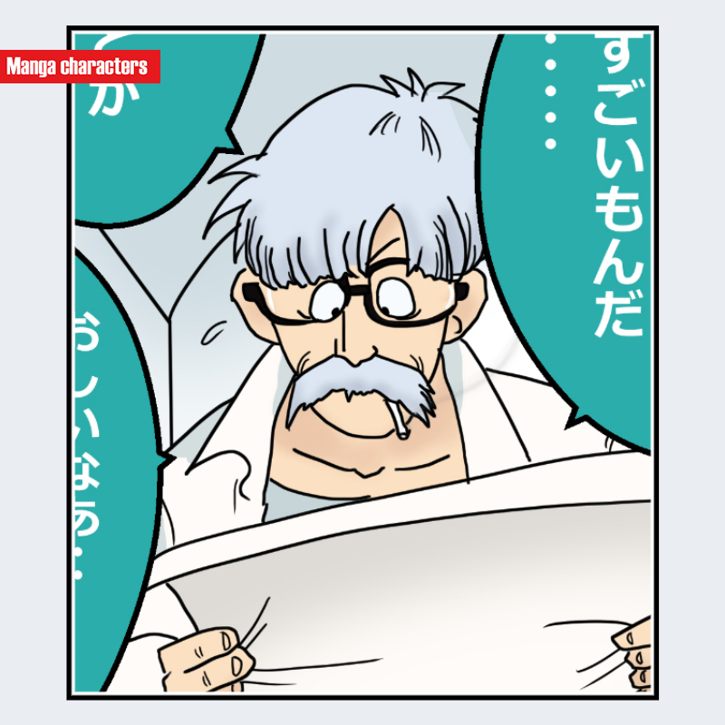 『ドラゴンボール』に登場するブリーフ博士は、白髪の乱れ気味の髪型と大きめの丸眼鏡、濃い口ひげを備えた外観が特徴である。白衣は肩から胸元へ自然な開きがあり、下に着用するシャツの襟がわずかに見える「衣服一体型」の構造をとる。顔の中心に位置する眼鏡と口ひげが視覚的焦点を形成し、衣装や体格よりも頭部の記号性が前面に出る造形である。同作の戦闘服主体のキャラクター群とは異なり、日常的衣服と研究者的装いが識別要素となっている。