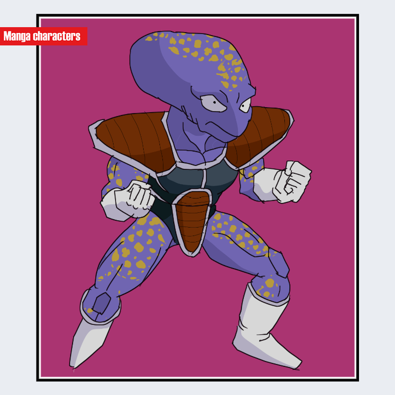 『ドラゴンボール』に登場するアプールは、紫色の皮膚と細長い頭部形状を持ち、体表には黄色の斑点が規則的に配置されている点が特徴である。胸部・肩部を覆うバトルアーマーは茶色と白の配色で、肩パッドは張り出しの大きい曲面構造となっている。アーマー下には黒い密着スーツが確認でき、「戦闘服融合型/外殻装甲構造」に分類される。四肢は細く、斑点模様が全身にわたり視覚的リズムを形成し、同作のフリーザ軍兵士群の中でも固有の外観を示している。