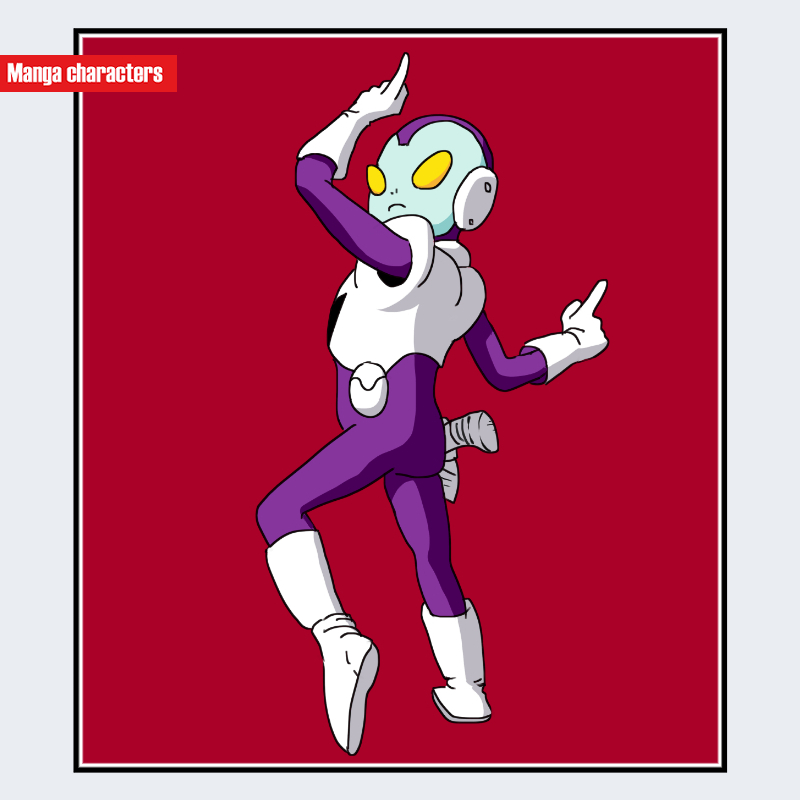 『ドラゴンボール』に登場するジャコは、淡い水色の頭部と大きく発光感のある黄色の眼を持つ、滑らかな輪郭のヘルメット一体型デザインが特徴である。頭部側面には円形のイヤーパーツが装着され、全体として「宇宙服融合型/外殻装甲構造」を示す。ボディは白を基調とした胸部外殻と、紫色の密着スーツが連続し、四肢は細く長いラインで描かれている。足元のブーツや手袋も一体的デザインとなっており、同作の地球人型キャラクターとは造形言語が大きく異なる。