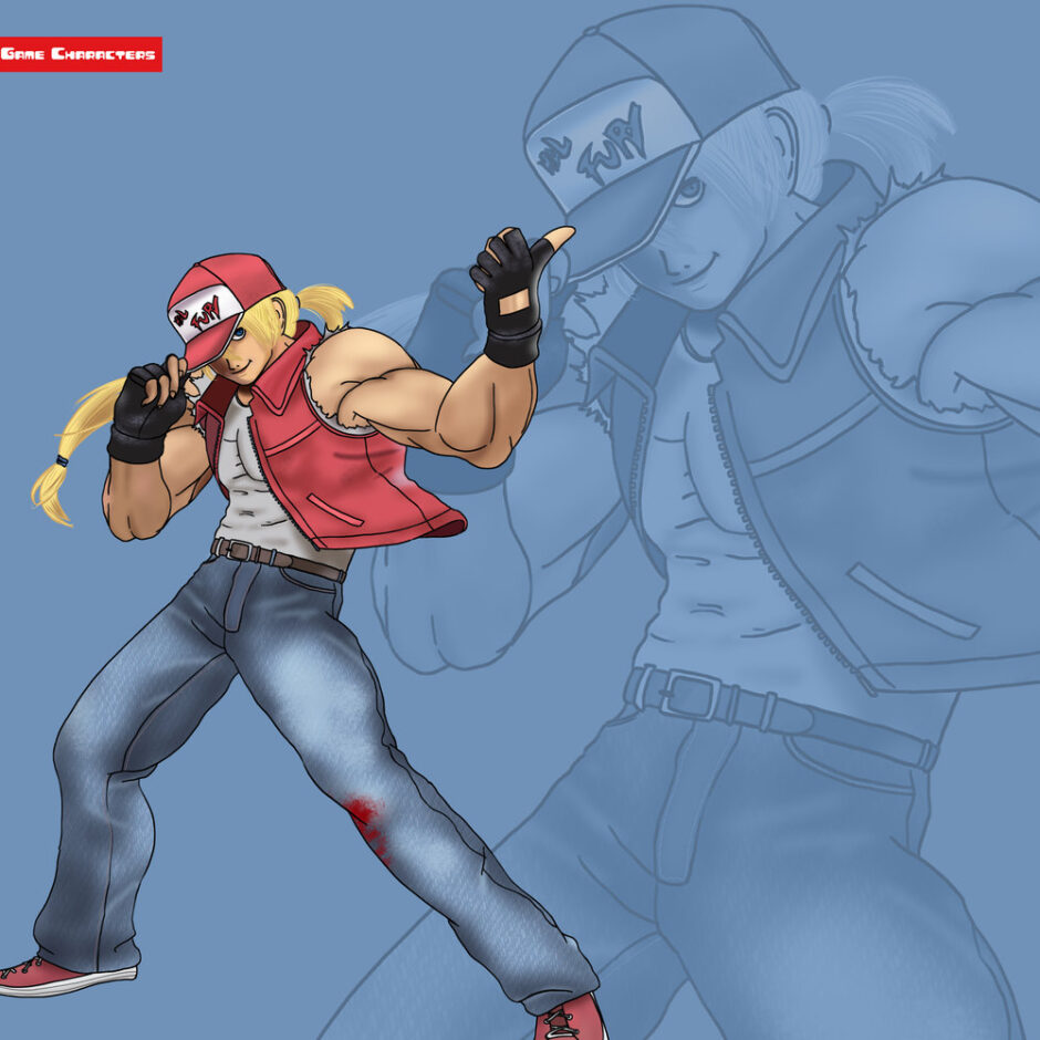 『餓狼伝説(1991年)』に登場するテリーは、金髪を後ろに束ねた男性格闘家である。赤いキャップとベストを着用し、白いTシャツとジーンズを合わせている。手には黒いリストバンド、足にはスニーカーを履く。体格は筋肉質でがっしりしており、全体はアメリカンスタイルのストリートファイター意匠を持つ。構造分類は「格闘ストリート型」に属する。