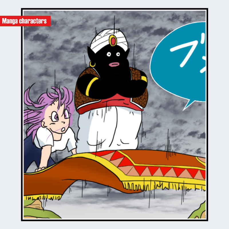 『ドラゴンボール』に登場するミスターポポは、全身が黒一色の滑らかな外皮で構成され、明確な輪郭線が強調された単色シルエット型のデザインを持つ。頭部には赤いターバンと金色の装飾パーツが組み合わされ、耳元には大きめの円形イヤリングが付属している。衣装は胴回りに膨らみを持つベスト型で、袖口や裾に装飾的パターンが施されている。腕は短めで丸みを帯び、全体として「擬人化造形」「民族衣装融合型」に該当する構造を示す。同作品内のデンデや界王などと比較すると、衣装要素の比重が高く、身体そのものの線情報が極端に簡略化されている点が特徴となる。