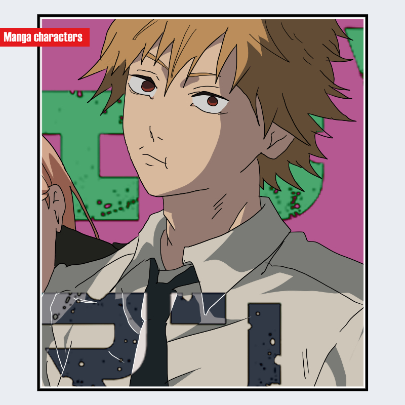 『チェンソーマン』に登場するデンジは、淡い金髪の短髪で、ランダムに跳ねる束感のある髪型が特徴である。前髪は不規則なジグザグ形状で額にかかり、側頭部は耳が見える程度の短さでまとめられている。衣装は白いシャツに黒いネクタイというシンプルな構成で、「制服融合型」の要素を持つ。首元から胸元にかけて直線的な影が入り、体格は細身で縦のラインが強調されている。