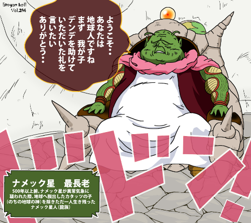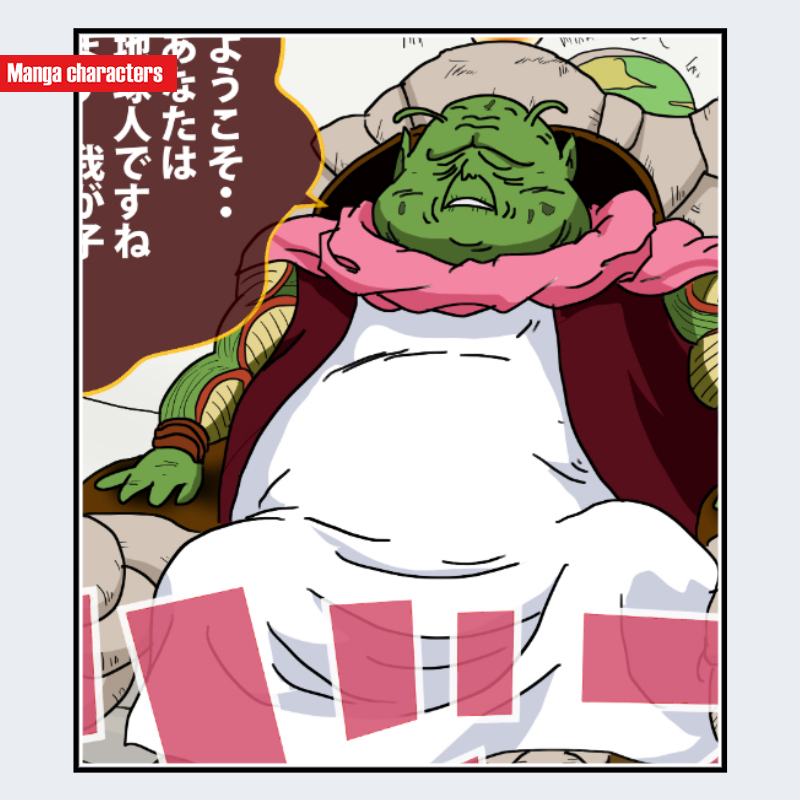 『ドラゴンボール』に登場する最長老は、全身が淡い緑色の外皮で構成され、頭部には深い皺と隆起が重なる重層的な生体構造を持つ。触角は短く前方へ向かって緩やかに湾曲し、顔面の凹凸が年齢的表現ではなく種族特有の構造として形成されている。衣装は白いローブを主体に、肩から背面にかけて大きく膨らんだ外装パーツ(殻状構造)を重ね、胸元にはピンク色の厚い布地が重層的に巻かれている。腕部にはナメック星人特有の筋束パッドが配置され、「異形外皮構造」「儀礼衣融合型」に分類される。