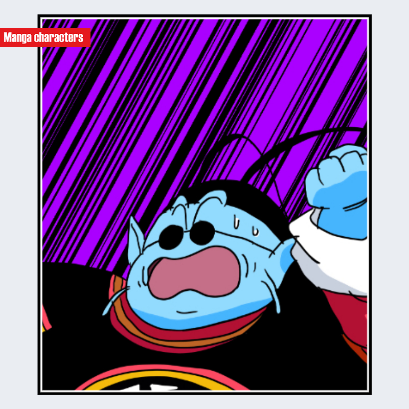 『ドラゴンボール』に登場する界王様は、丸みのある青色の外皮と小柄な体格を持ち、頭頂部には細く長い触角が左右に向かって湾曲する配置となっている。丸型の黒いサングラスを常時装着し、顔面の大部分を隠すシルエットが特徴的である。衣装は黒を基調とした上衣に赤い縁取りを施し、胸部には円形の象徴記号が配置されている。肩や腹部は厚みを帯びた構造で、体型の円弧を強調するような衣装の裁ち線が採用されている。全体として「異形外皮構造」「象徴衣融合型」に分類される。