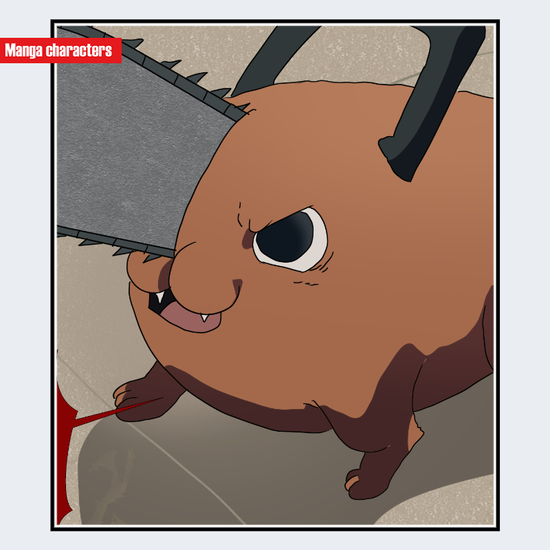 『チェンソーマン』に登場するポチタは、丸みの強い胴体と短い四肢を持つ小型の生物で、頭部にチェンソーの刃が突き出した特異な外観が際立つ。体色は橙寄りのブラウンで、耳・鼻まわりは小さく簡略化された形状で構成されている。目は楕円形の白目に黒い瞳孔というシンプルな配置で、「擬獣化構造/機械融合型」に分類される。胴体のラインは丸く、足先は小さな塊状で描かれている。