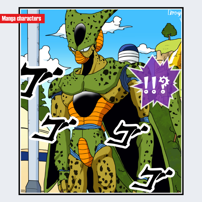 『ドラゴンボール』に登場するセルは、全身を覆う硬質外皮と昆虫的意匠を組み合わせた複合シルエットが特徴である。頭部は先端が尖ったドーム状構造で、黒い甲羅状パーツが額から後頭部へ連続している。胸部は艶のある黒色の外殻が中央に配置され、周囲には筋束を意識した橙色の縦ラインが走る。腕部・脚部には緑色外皮に黒い斑点が散在し、膝や肩は球状パッドで補強されている。構造分類としては「擬昆虫外殻構造」「多層装甲型」に分類され、同作品のフリーザ一族と比較すると、有機的パターンと昆虫型外皮の組み合わせが明確な差異となる。