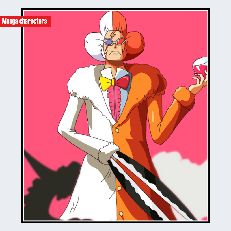 『ONE PIECE』に登場するイナズマは、左右で大きく色分割された特徴的な衣装と髪型を持つキャラクターである。髪は左右対称の球状シルエットで構成され、白とオレンジの明確なツートーン構造となっている。衣装も同様に左右で白とオレンジに分割され、片側にファー装飾が施された非対称コートが視覚的な主軸を成す。胸元には左右色違いの蝶ネクタイとフリルが配され、全体として「左右分割型/カラー対称構造」が強調されている。サングラスや稲妻形の額装飾は、同作品のボン・クレーなど「強記号型デザイン」を持つキャラとの系統的比較が可能である。