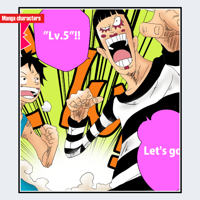 『ONE PIECE』に登場するMr.2・ボン・クレーは、短く切り揃えられた前髪と丸みのあるシルエットの髪型が特徴で、顔面には左右対称に円形のチークと目元の濃いラインが施された「強記号型」の装飾が見られる。上半身は囚人服のような白黒ボーダーの衣装で構成され、袖や首元まで一体化した「ボーダー統一構造」が中心となる。大きく開いた口元の誇張表現や指先の角度も、同作に見られるデフォルメ強調型デザインの範囲に含まれる。イナズマと比較すると、ボン・クレーは色分割よりも「顔面記号」「線の反復」による造形要素が支配的である。