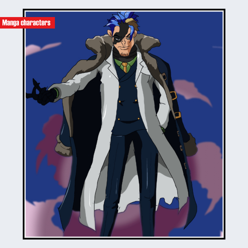 『ONE PIECE』に登場するアイザックは、上半身を中心とした視認情報から、白いロングコートを基調とした「軍服融合型」の衣装構造を持つキャラクターである。深い青色のスーツと金具装飾を重ねた多層構造が特徴で、首元には明確な配色差を持つネクタイが挿入されている。髪は青と茶の分割配色で、前髪のみ大きく垂れる非対称デザインとなっている。また、右目周辺を覆う黒のマーキングが顔の中心構造を強調し、右肩から外套状のファーが掛かることでシルエットに厚みが生まれている。同作品内では、海軍系キャラの白コート構造と、科学者系の細身シルエットの双方に近い分類となる。