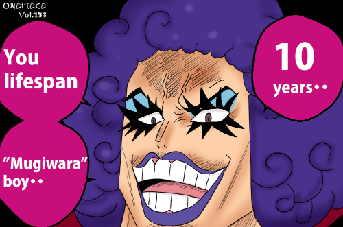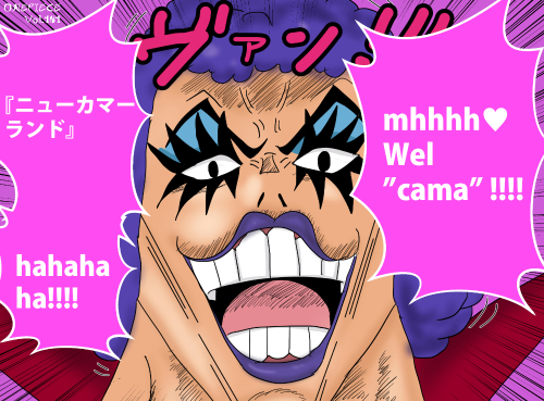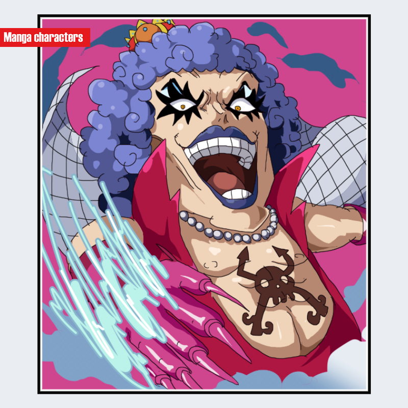 『ONE PIECE』に登場するエンポリオ・イワンコフは、上半身の視認情報から、極端な装飾性を伴う「舞踏装飾型」の衣装構造を持つキャラクターである。紫系の豊かなカールヘアが大きく広がり、顔周囲の黒い星形メイクが強い視覚要素として配置されている。胸元は開放的なデザインで、パール状のネックレスと、胸部中央に描かれたシンボルマークが特徴的である。肩部には金属的質感の網状パーツが確認でき、衣装の舞台衣装的構造を強めている。同作品内では、王下七武海に属する人物の一部が持つ派手な衣装構造と比較しても、特に誇張された装飾層が際立つ分類に属する。