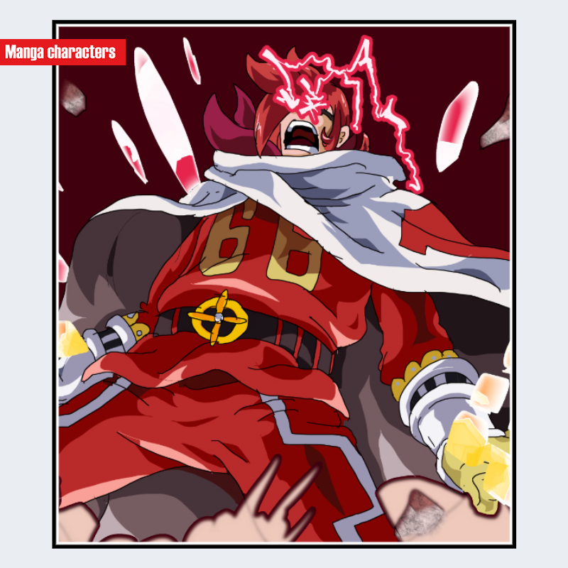 『ONE PIECE』に登場するヴィンスモーク・イチジは、上半身の視認情報から、赤系装束と発光エネルギー表現を併せ持つ「強化戦闘装束型」の構造を持つキャラクターである。髪は赤色で後方へ跳ね上がる鋭角的シルエットを形成し、目元には雷状の発光ラインが走る視覚的強調が確認できる。衣装は赤を基調としたスーツで、胸部には大きな数字デザインが配置され、戦闘用装束としての機能的象徴を示している。首元には大判のマント状布が巻かれ、上半身のボリュームを大きく見せるレイヤーを構成している。同作品内のジェルマ系装束と共通する機械的・戦闘特化の構造で、特に発光エフェクトを伴う点が本キャラの視覚的識別要素となる。
