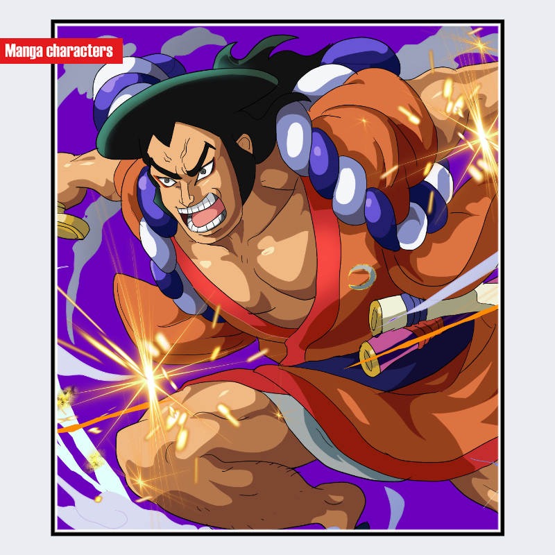 『ONE PIECE』に登場する光月おでんは、上半身の視認情報から、和装と武具装飾を併せ持つ「武装和装型」の構造を持つキャラクターである。髪型は頭頂部で縦に盛り上がる特有の形状で、側頭部へ向かう太い束が逆向きに流れる構造が確認できる。衣装は橙系の羽織を基調とし、胸元は大きく開く武士装束の形状で、腰部には二振りの刀が帯に差し込まれている。肩には大きな玉状の数珠装飾が左右対称に並び、シルエットに重量感を与えている。同作品内の侍系キャラクターと共通点を持ちながらも、髪形と数珠の組み合わせが明確な識別要素となる。